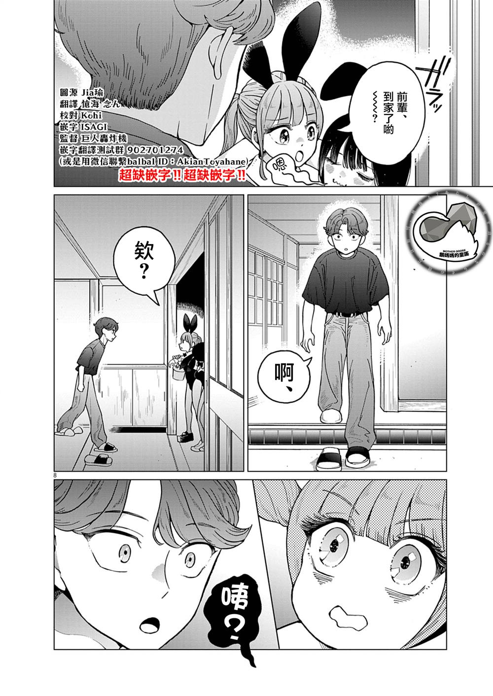 鹅妈妈的童谣-组长 9:34:27 作品:兔女郎的夜晚疗愈 作者:东云 简介:你喜欢兔女郎的大姐姐吗? 大学生凑晚上有一件要做的事。那就是照顾一位每天接近午夜0时才回到家而且昏昏欲睡的兔女郎。 她就是大凑8岁的姐姐?美冬。 虽然住在一起,但彼此之间并没有血缘关系… 这是一个宠爱著并非家人但也绝[]绝非陌生人的兔子,直到哄她入睡的故事。 [-折叠]